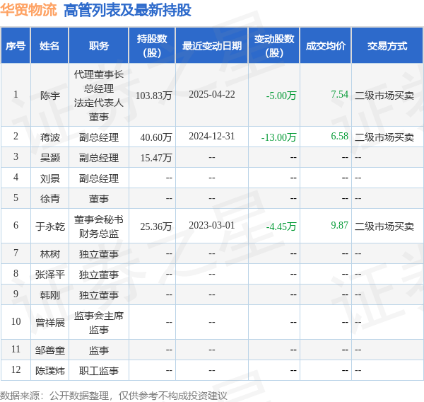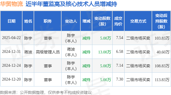 华贸物流近半年内的董监高及核心技术人员增减持详情如下: